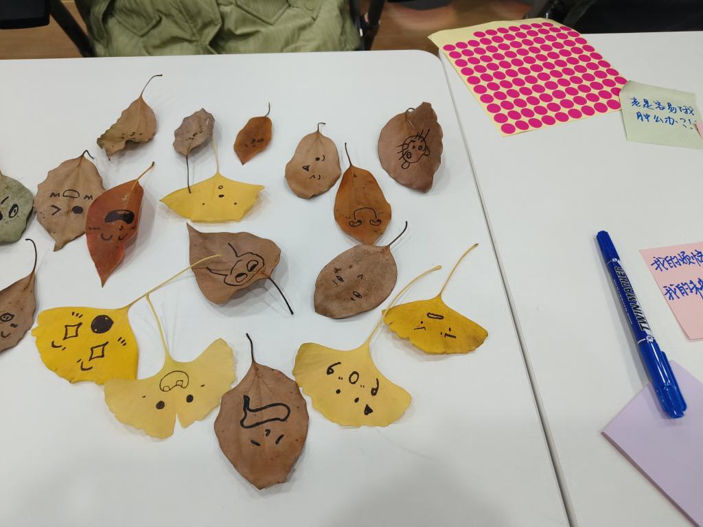 在大自然中寻找同学们自己喜欢的树叶,在树叶上画上自己最想表达的情绪表情,享受寻找树叶和表达情绪的过程